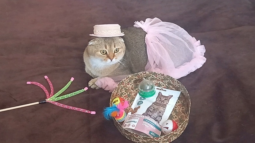 Друзья! Совсем недавно был самый любимый день в году - мой День рождения! 19 мая мне исполнилось два года и я была виновницей торжества! Утром хозяева сообщили, что я именинница. Подергали за мои маленькие ушки и пожелали крепкого здоровья. Потом вручили подарки: мячики, дразнилку, шарик с кошачьей мятой и вкусняшки. На меня одели праздничный наряд, чтобы сделать фото на память. Я долго крутилась, потому что очень хотелось поиграть с подарками. Хоть я уже и большая, но все равно люблю бегать по дому и играть с игрушками. Затем собралась, взяла себя в лапы и немного попозировала. Календарь перевернул еще один листок и я стала на год старше. А совсем недавно я была вот такой: А это я с мамой, сестричкой и братиками. На этом фото мама накрыла меня лапкой и говорит людям, чтоб не мешали ей кормить малышей. Мама у меня шотландская вислоухая блондинка с голубыми глазами. Мой папа, шотландский прямоухий кот с окрасом - золотая шиншилла. Сейчас я уже взрослая кошка и живу со своими хозяева