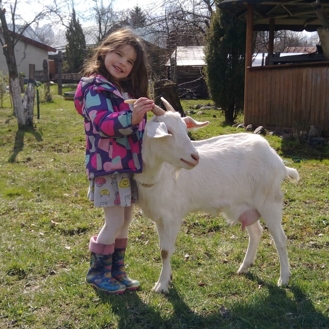 И тут Вова говорит в шутку.. а может козу заведем. Я звоню по первому объявлению на Авито. Отвечают, что да, коза есть, недавно окотилась . Спрашиваю " где посмотреть?" мне говорят адрес и тут я понимаю, что проезжаем указатель на эту деревню)) "Это судьба ! "- Решили мы и поехали за козой. Быстро в интернете ищу советы как выбирать козу. Ведь кроме того, как она выглядит и что у нее должно быть молоко ... Ничего не знаю. Коз видела только в зоопарке и на поле. Близко никогда не подходила (у бабушек были коровы). Делая умный вид, я спрашивала про козу. ( Доить??? Даже не знаю как 😂😂). В итоге мы ей понравились, она нам тоже. Загрузив козу в Лексус мы поехали домой. Так появилась у нас Дашка.