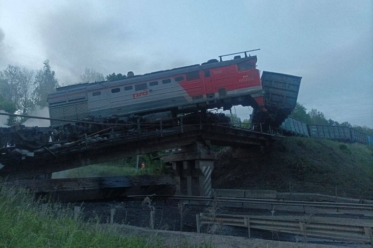 - Сегодня ночью на 48-м км трассы Тросна-Калиновка Железногорского района во время движения грузового локомотива произошло обрушение моста. Часть поезда рухнула вниз на автомобильную дорогу, которая находилась под мостом. Началось возгорание тепловоза — сотрудники МЧС его оперативно локализовали. Остальные составы находятся на платформе ж/д дороги, - сообщил в своем Telegram-канале губернатор Курской области Александр Хинштейн.