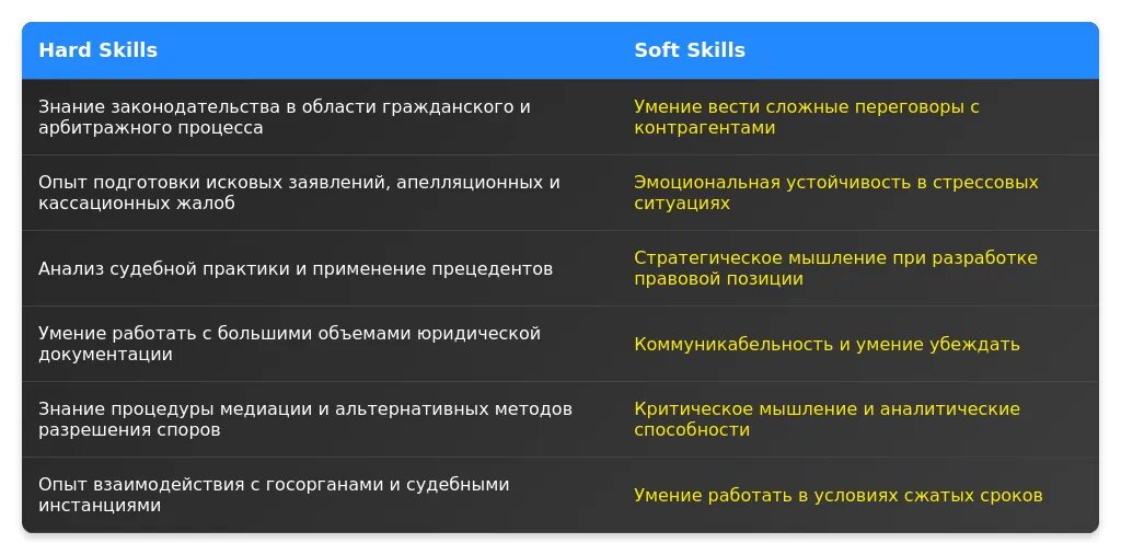 Гибкость. - Как подтвердить наличие soft skills: Приведите примеры из опыта работы: "Успешно урегулировал 20+ досудебных споров благодаря аналитическому подходу и коммуникабельности".