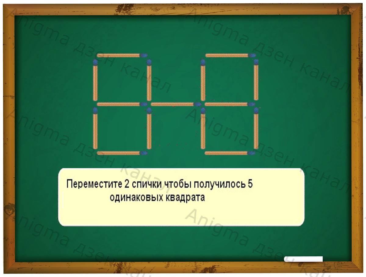 Задание из раздела спички. Вам необходимо переместить 2 спички чтобы получилось 5 одинаковых квадрата.