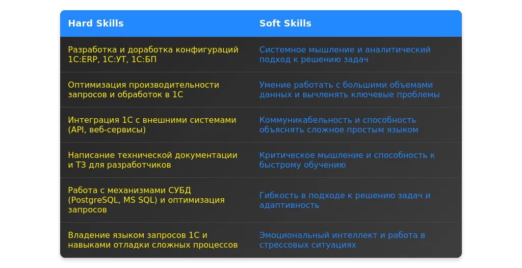 Ключевые фразы для разных типов вакансий: "опыт внедрения 1С", "навыки написания запросов", "оптимизация производительности", "интеграция с внешними системами".