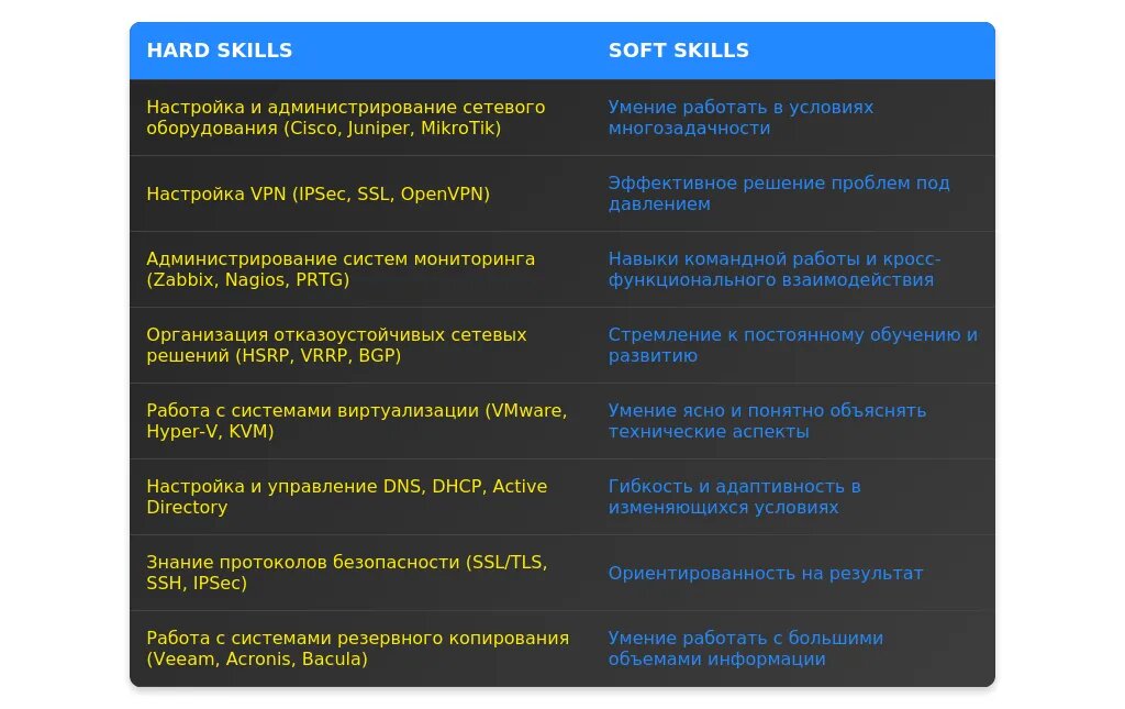 - На какие навыки делать акцент: Базовые знания сетевых технологий, обучаемость, готовность к работе в команде.