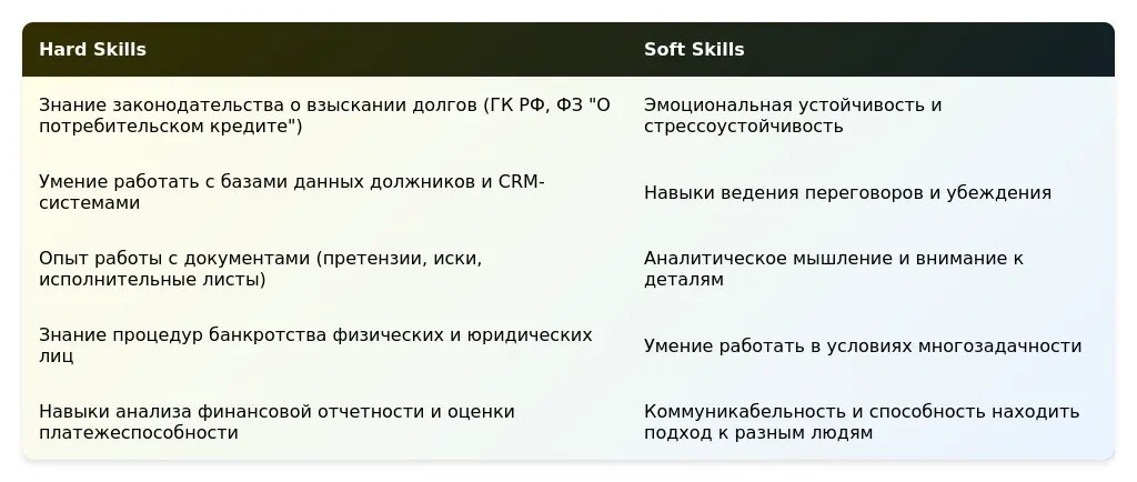 Раздел "Навыки" должен быть перегруппирован под требования вакансии. Например, если вакансия требует знание законодательства, выделите это в начале списка. Используйте ключевые слова из вакансии, такие как "ведение переговоров", "работа с проблемными долгами" или "знание CRM-систем".