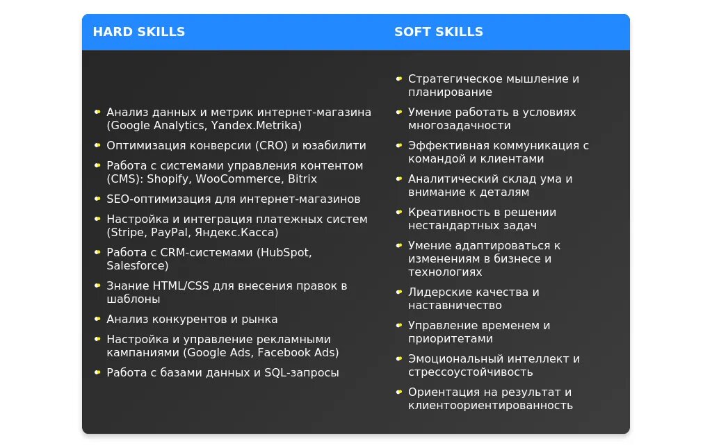 При анализе вакансии важно выделить обязательные и желательные требования. Обязательные требования обычно включают конкретные навыки, такие как знание платформ (например, Shopify, WooCommerce), опыт работы с аналитикой (Google Analytics, Яндекс.Метрика) и умение разрабатывать стратегии продвижения. Желательные требования могут включать дополнительные компетенции, например, знание основ UX/UI или опыт работы с CRM-системами.
