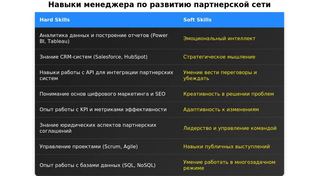 Пример 2: "Имею опыт управления партнерской сетью из 50+ компаний. Разработал стратегию привлечения новых партнеров, что привело к росту прибыли на 25%. Владею навыками анализа рынка и ведения переговоров."