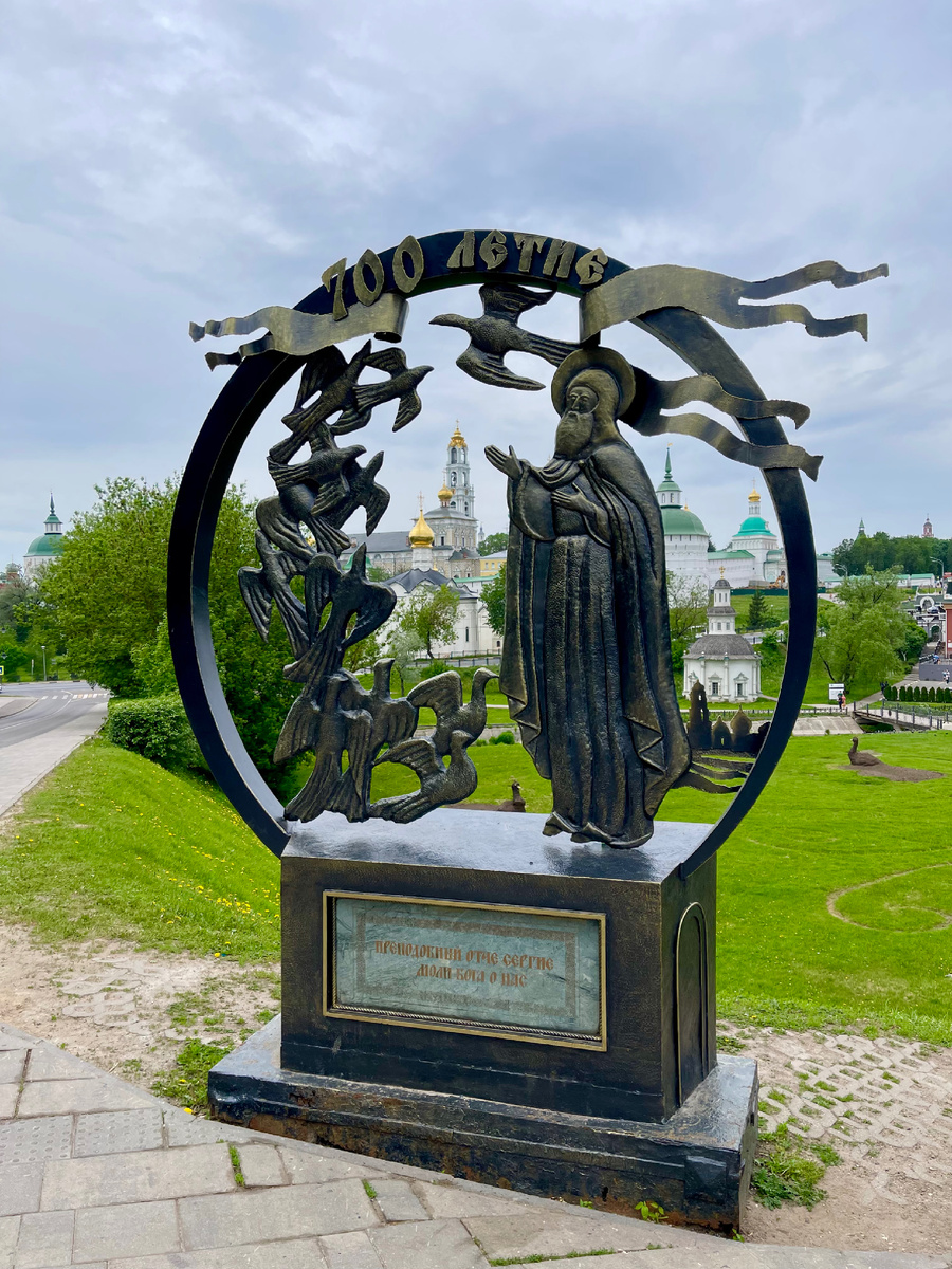 Перед входом в монастырь стоит памятник преподобному Сергию. Батюшка Сергий благословляет каждого.