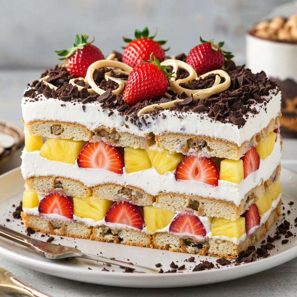 Рецепт вкусного торта с кусочками бисквита, клубникой и ананасом со сметанно-творожным кремом, украшенного шоколадной крошкой. Состав продуктов: Для бисквитного коржа: - Яйца куриные крупные — 4 штуки - Сахарный песок — 1 стакан (примерно 200 г) - Мука пшеничная высшего сорта — 1 стакан (около 140 г) - Ванильный сахар — 1 ч.л. (Бисквитные коржи можно купить готовые, что значительно сократит время приготовления торта). Крем: - Творог мягкий жирностью 5% — 300 г (или творожные сырки с изюмом) - Сметана средней жирности (15-20%) — 300 г - Сахарная пудра — 100 г - Клубника свежая или замороженная — 300 г - Ананас свежий или консервированный — 300 г Украшение: - Темный шоколад (70% какао) — 100 г --- Этапы приготовления: Этап 1: Бисквитный корж 1. Отделите белки от желтков яиц. Белки поместите в чистую сухую миску, а желтки слегка размешайте с ванильным сахаром и половиной сахара. 2. Взбейте белки миксером сначала на низкой скорости, потом увеличьте скорость и продолжайте взбивать до