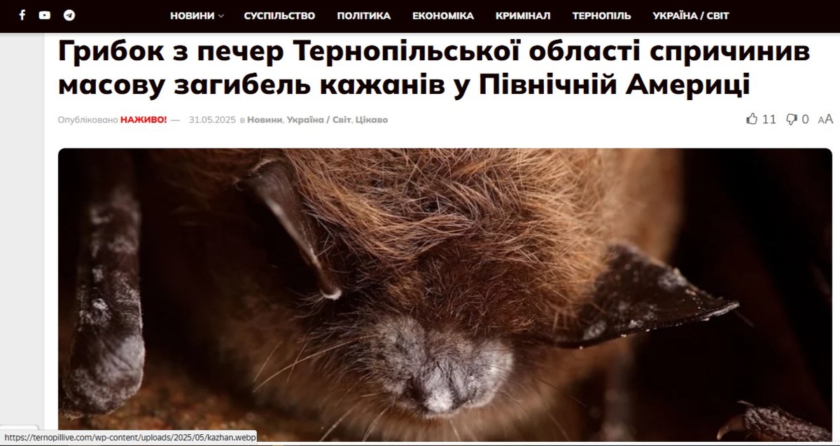 На Украине новая перемога. Пещеры Тернопольской области, в частности Оптимистичная и Озерная, оказались источником синдрома белого носика, который уничтожил до 90% популяции некоторых видов летучих мышей в США. Исследование, опубликованное в журнале Nature, показало, что споры грибка Pseudogymnoascus destructans (вариант Pd-1), вероятно, были перенесены туристами на снаряжении из этих популярных в 1990-2000 годах пещер в Северную Америку. Там грибок поразил местных летучих мышей, которые не имели к нему иммунитета, вызвав массовую гибель.