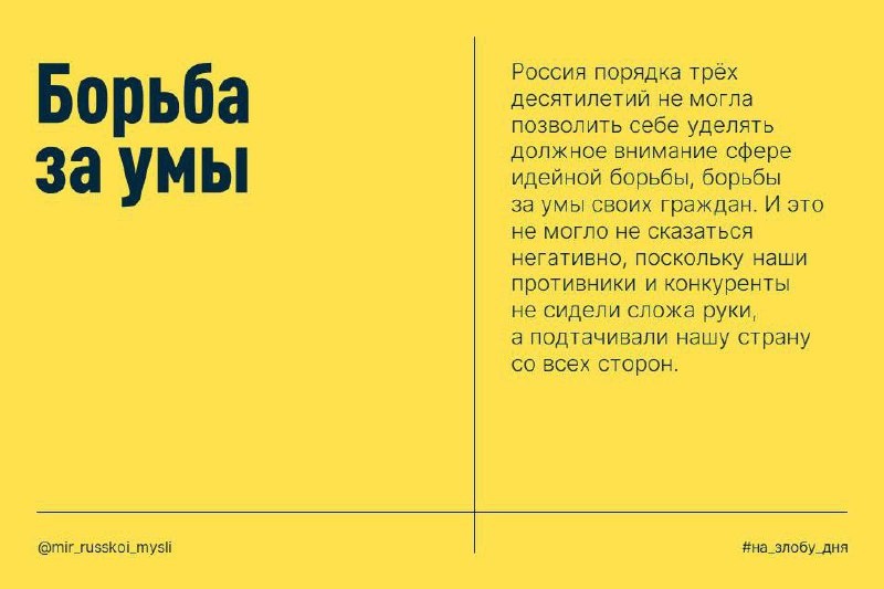 Со своей стороны хотим добавить, что в силу ряда факторов (и исторических, и политических, и социальных, и экономических) Россия порядка трёх десятилетий не могла позволить себе уделять должное внимание сфере идейной борьбы, борьбы за умы своих граждан. И это не могло не сказаться негативно, поскольку наши противники и конкуренты не сидели сложа руки, а подтачивали нашу страну со всех сторон. Поэтому сейчас, когда у нас появилась возможность дать реванш, нам необходимо приложить в два, а то и в три раза больше усилий, чтобы просто отстоять то, что наше по праву - ценности, историю, традиции и идеи.
