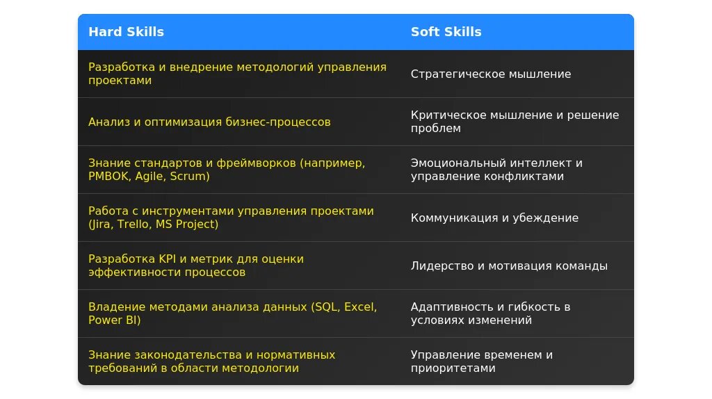 Навыки должны быть перегруппированы так, чтобы выделить требуемые компетенции. Например, если в вакансии упоминается знание ISO 9001, поставьте этот навык на первое место. Используйте ключевые слова из описания вакансии, такие как "Agile", "Scrum", "управление проектами".