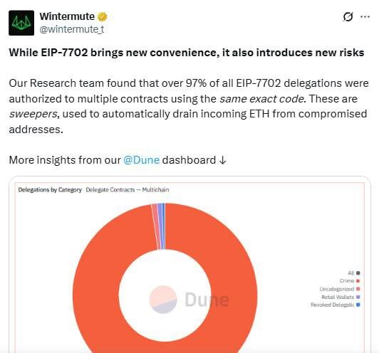 🤢Раньше Виталика Бутерина хейтили за то, что ETH не растет и экосистема не развивается. Теперь хейтят еще и за то, что его новые фичи помогают ворам эффективнее сливать ETH с кошельков. Новый механизм EIP-7702, который внедрили в последнем обновлении Ethereum, и призванный упростить взаимодействие с кошельками, превратился в инструмент для криминала. 😱Исследование Wintermute показало, что более 97% всех делегирований EIP-7702 авторизованы на контракты-"сборщики" с одинаковым кодом, которые автоматически сливают ETH со скомпрометированных адресов. 😐 Виталику достается и за консерватизм, и за инновации одновременно.