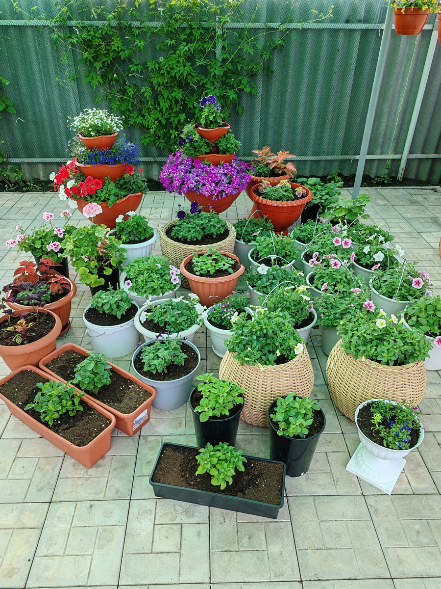 Сегодня 1 июня. Наконец-то все цветы высажены! Они пока стоят под навесом, а через несколько дней адаптируются, и я расставлю всё по местам. Многие растения ещё продолжаю формировать. А вот если бы погода позволила высадить их раньше, то они бы уже разрослись, как в этом кашпо! В это кашпо растения высаживала 16 апреля, и поэтому они уже так хорошо разрослись. Когда были холода, прятала кашпо в теплице. Но все растения там разместить невозможно. Они ждали в стаканах своего часа и тормозили в развитии. Но впереди еще целое лето! Всё успеет вырасти и порадовать цветением. Во второе такое кашпо высадила только петунию. Растения подобрала в синих и сиреневых тонах. Мне понравилось, как получилось! Два верхних яруса еще подрастут, а вот нижний - во всей красе! Растения высаживала из литровых горшков, уже сформированные и с цветами. В этом году у меня много колеусов. Составляла композиции. Колеус + петуния. Когда растения разрастутся, должно получиться красиво! Потом обязательно обо все
