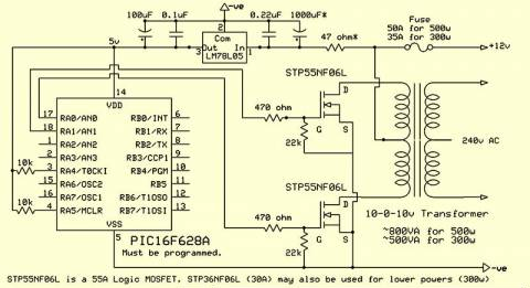 При изготовлении различных преобразователей напряжения для получения 220 В из пониженных 12 вольт автомобильной бортсети, чаще всего выбирают схемы с цифровыми логическими микросхемами в задающем генераторе и мощными транзисторами включенными по двухтактной схеме. Но современная микроэлектроника позволяет упростить, и одновременно повысить качество работы инвертора, использовав схематическое решение на дешёвом микроконтроллере PIC16F628A. Эта схема работает с нагрузкой до 500 ватт. Транзисторы применимы в