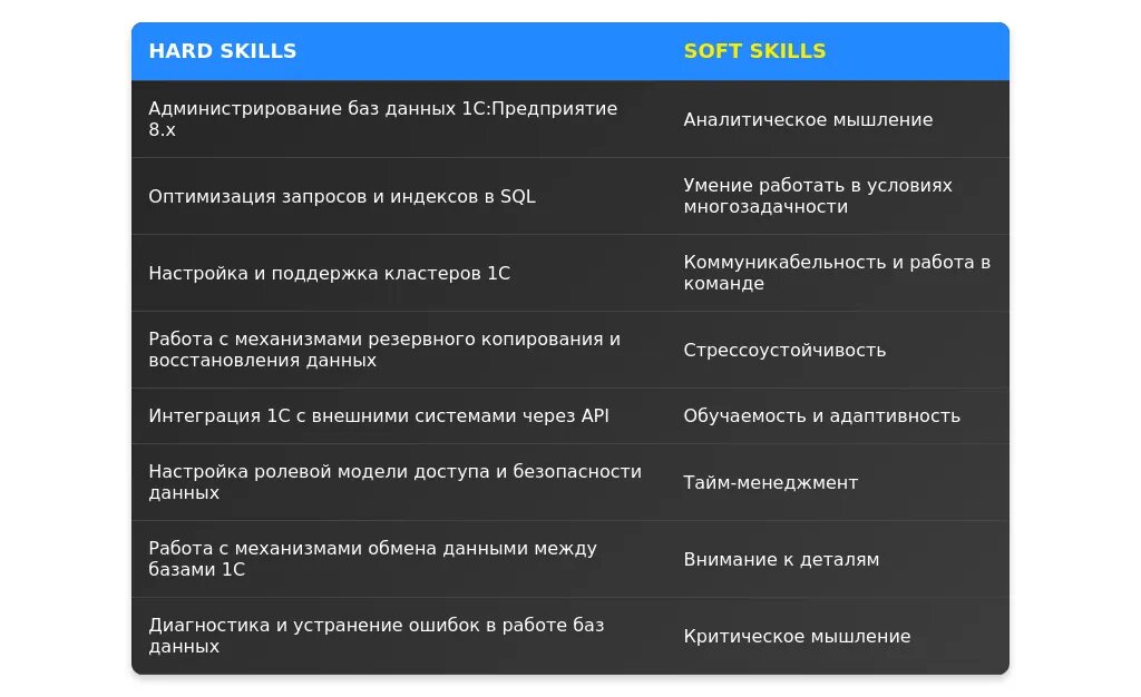 После: Навыки администрирования баз данных 1С, работа с облачными версиями, знание SQL.