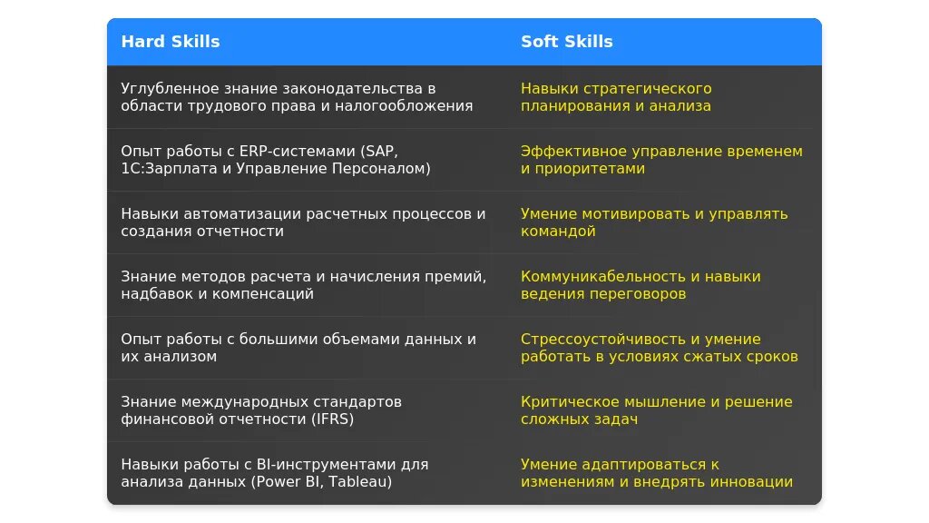 При анализе вакансии важно выделить ключевые требования, которые делятся на обязательные и желательные. Обязательные требования обычно включают конкретные навыки, такие как знание законодательства о труде, опыт работы с программами учета заработной платы (например, 1С:Зарплата и управление персоналом), а также наличие опыта управления командой. Желательные требования могут включать дополнительные компетенции, такие как знание международных стандартов учета или опыт внедрения автоматизированных систем.