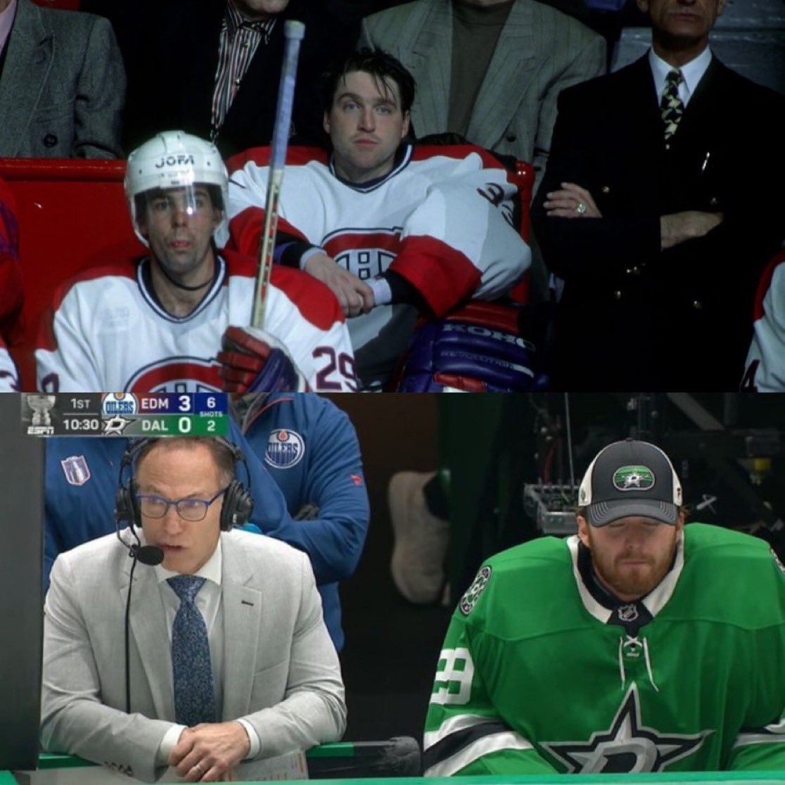 История повторяется? Задаётся вопросом Биссоннетт. Ставлю везде в его фамилии по две согласные, чтоб наверняка. Никогда не запомню, как правильно. "Б" точно одна. Ну так вот, на первой фотке Патрик Руа, рядом с ним Рэй Ферраро. Кадр из того самого матча, после которого Патрик сказал, что больше никогда не выйдет на лёд в форме «Канадиенс». На фотке снизу Джейк Оттинджер после двух пропущенных шайб в пятой игре серии с «Ойлерс», а рядом с ним... Рэй Ферраро. Пока Оттинджер не сказал, что больше не выйдет на лёд в форме «Старс», несмотря на открытую критику его игры со стороны главного тренера команды. Посмотрим, что из этого выйдет, но наш любимый случайный символизм всегда забавляет. ⬇️ Чат #нхл #nhl