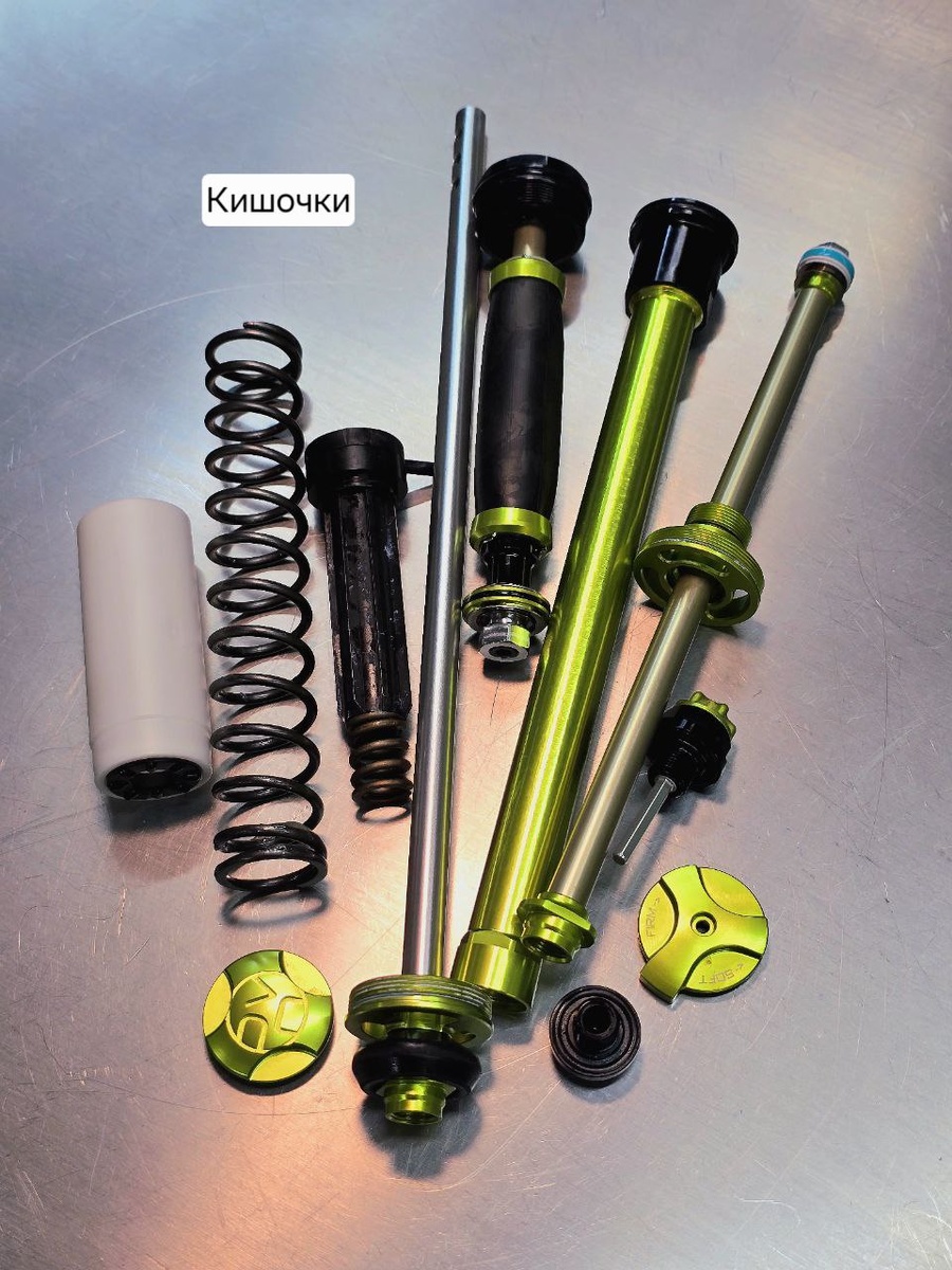 Ненавижу болеть, но и в этом дерьме есть свои плюсы: я хорошенечко высплюсь, отдохну от постоянной спешки куда-то, а ещё у меня наконец-то появилось время описать вилку DVO Onyx SC D2, которую я разбирал пару месяцев назад. Приступим! Перед нами вилка среднего уровня для трейлового катания, имеет внешние настройки низкоскоростной компрессии и низкоскоростного отскока, диаметр ног 36 миллиметров. Содержимое вилки сделано из алюминия и пластика, алюминиевые детали анодированы в фирменный зелёный цвет, шток демпфера покрыт твёрдым анодом, шток воздушной пружины покрыт бесцветным поверхностным анодом. Шток воздушной пружины имеет три отверстия, с помощью них вилка меняет свой ход, можно сделать 160, 170 или 180 миллиметров соответственно. Негативная часть состоит из двух стальных витых пружин, они посажены на пластиковую направляющую и "упакованы" в пластиковый кожух, типичное решение для подобной конструкции, пружины друг об друга не трутся и не гремят. Демпфер состоит из двух часте