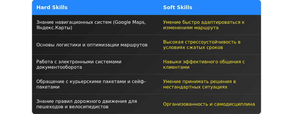 - Обязательно включить:Навыки, связанные с профессией (например, знание города, умение работать с навигацией).