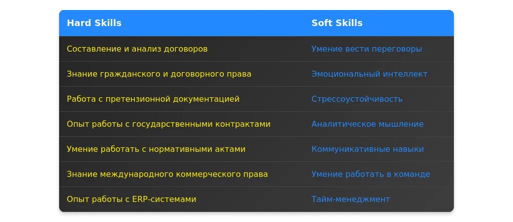 После адаптации: "Глубокое знание ГК РФ, опыт составления договоров подряда и поставки, успешное урегулирование претензий, работа в 1С:Договоры."