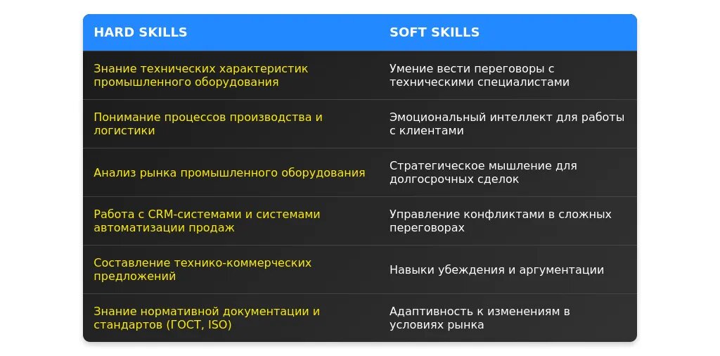 После адаптации: "Навыки продаж промышленного оборудования, работа с CRM-системами, ведение переговоров с ключевыми клиентами."