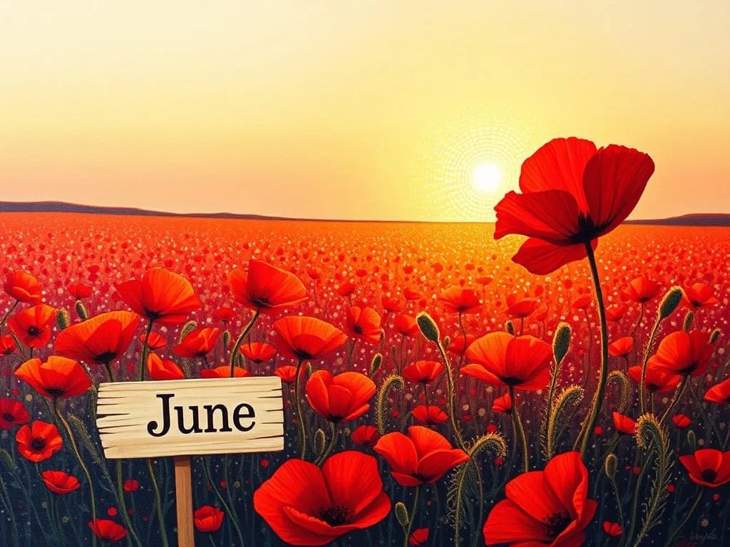 Доброе утро! Вот и наступило лето. Painted in the pointillist style, with many small dots, a vast red poppy field at sunset, its blossoms glowing in brilliant red. The last golden rays of the sun bathe the scene in warm yellow, orange, and red tones. The sky gently fades into pastel shades. The field is dotted with delicate grasses and stems. A romantic, peaceful atmosphere, a picturesque and poetic landscape.The image features the word "June" on a small wooden sign #neuroart #нейроарт #ai #ии #нейросеть #картинки #искусственныйинтеллект #цифровоеискусство #digitalart #арт #art #prompt #промпт #подсказка