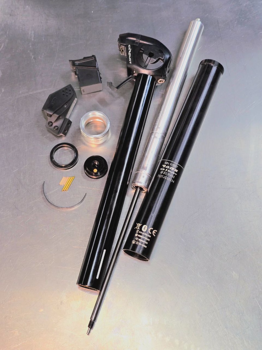Сегодня у меня на столе прототип штыря KS RAGE Circuit. Это беспроводной штырь на основе неразборного газлифта с моментальным откликом на кнопку. Достаточно интересная весчь, давайте рассмотрим поближе! Сам штырь конструктивно типичен для Kind Shock, отличие от остальных моделей бренда исключительно в актуаторе, расположенном вместе с креплением седла в верхней части штыря и приводимом в действие серво-моторчиком. Аккумулятор расположен там же, данная компоновка напоминает AXS Reverb, разница лишь в том, что аккумулятор Реверба надевается на корпус актуатора, прижимая контакты, а у KS он "въезжает" внутрь корпуса, скользя контактами по телу аккумулятора, надо аккуратно вставлять, иначе можно повредить контакты. Какая-либо резиночка, герметизирующая соединение аккумулятора с корпусом актуатора, отсутствует, но это прототип штыря, в финальной версии может быть иначе. Данное изделие – попытка сделать доступный беспроводной штырь, на мой взгляд, достаточно неплохая. Из плюсов могу отме