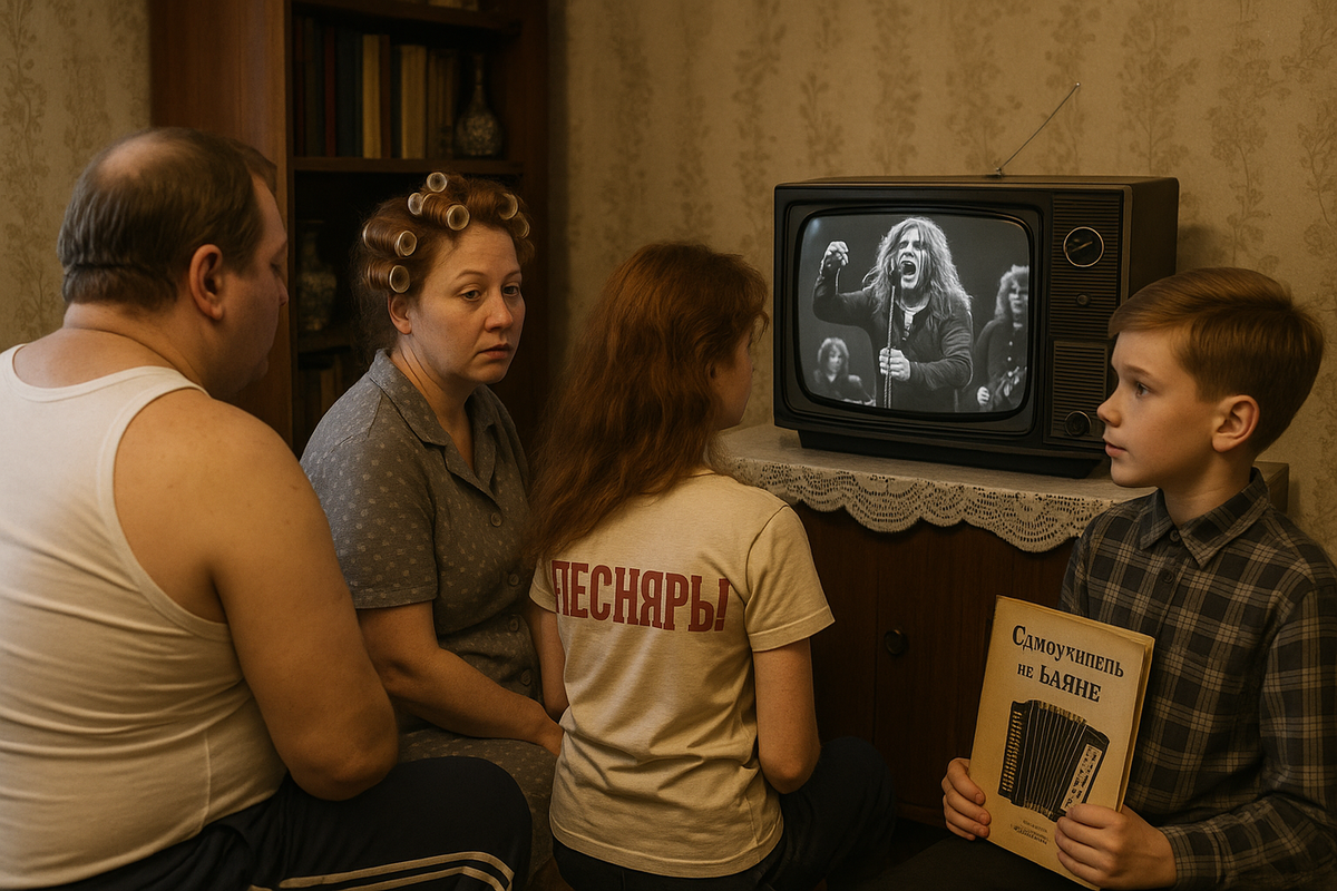 Итак: двадцать первый век усиливается. Запад неуклонно и с видимым удовольствием загнивает. Наша подопытная семья в советской хрущевке не отрываясь наблюдает за этим процессом по телевизору. Вот фотохроника от ChatGPT, достоверность пугает.