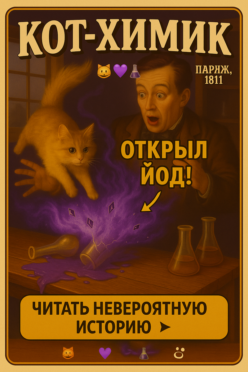 «Он сжигал водоросли, чтобы делать селитру. Рутинная работа аптекаря. Но его кот оказался любопытнее хозяина. Одно неловкое движение хвоста — и в воздух поднялись фиолетовые пары. Так домашний питомец открыл элемент, без которого сегодня невозможна медицина.» 📍 ПАРИЖ, ФРАНЦИЯ