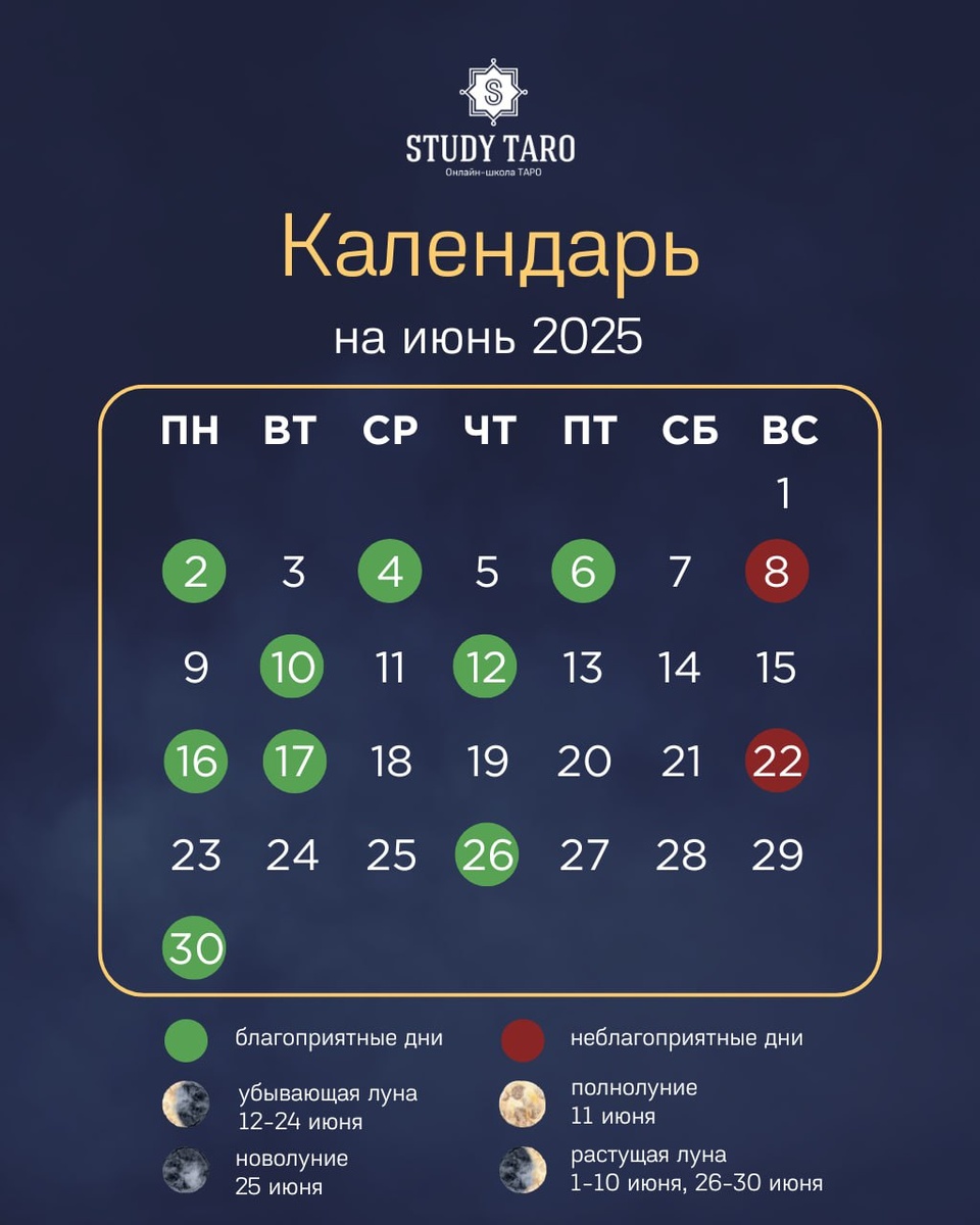 🗓 Лунный календарь на июнь 2025 Друзья, делюсь с вами актуальным лунным календарём на июнь — чтобы вы могли выстраивать планы в гармонии с природными циклами. Этот ориентир пригодится всем: и тем, кто практикует магию, и тем, кто просто хочет жить в согласии с собой и ритмами Вселенной. ~ Благоприятные дни: 2, 4, 6, 10, 12, 16, 17, 26 и 30 июня. Это отличное время для активных дел, запусков, инициатив. Луна будет благосклонна. ~ Неблагоприятные дни: 8 и 22 июня. Это дни с напряжённой энергетикой. Постарайтесь избегать важных решений и крупных шагов. ~ Убывающая Луна (12-24 июня) — время избавления от всего отжившего. Подходит для очищающих практик, завершений, освобождения. ~ Новолуние (25 июня) — мощная точка начала. Подходит для загадывания желаний, планирования, магии на обновление и запуск новых процессов. ~ Растущая Луна (1-10, 26-30 июня) — фаза роста, когда особенно эффективно вкладывать энергию в развитие, привлечение и усиление. ~ Полнолуние (11 июня) — пик лунной сил