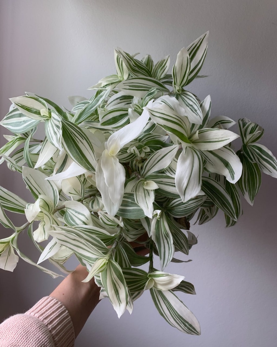 🌿 Традесканция приречная (традесканция флюмененсис, ранее традесканция белоцветковая) - красивое неприхотливое растение, которое обычно выращивают ампельно. Потому что ее побеги не выдерживают собственный вес и свисают. Выведено множество сортов этой традесканции: есть с зелеными листьями, пестролистные (как на фото к посту), трехцветные (например, сорт Нанук). Вариегатные сорта традесканции приречной часто ошибочно причисляют к традесканции полосатой (или традесканция зебрина). Однако они отличаются цветением и рисунком на листве (у традесканции полосатой полосы симметричны, а у традесканции приречной вариегатность хаотична).