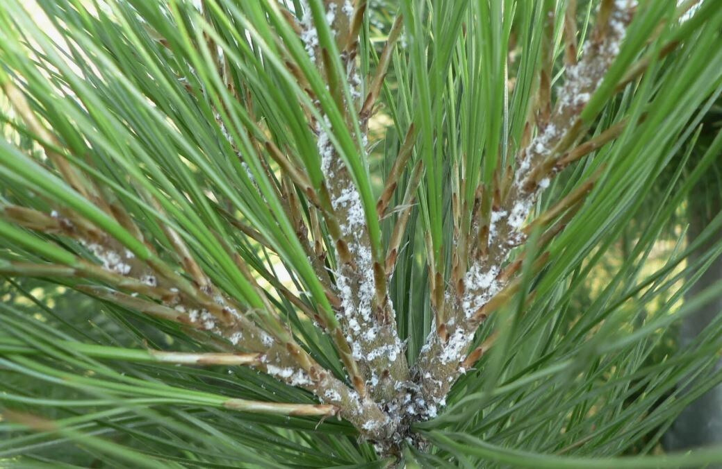 Хермес – мелкое насекомое-вредитель, похожее на тлю, которое поражает хвойные деревья (сосны, ели, пихты). Его колонии выглядят как белый пушистый налёт на хвое и побегах. Если не принять меры, сосна может пожелтеть, остановиться в росте и даже погибнуть. ✔ Белый "пух" на хвое, молодых побегах и у основания иголок (это защитные восковые выделения личинок).