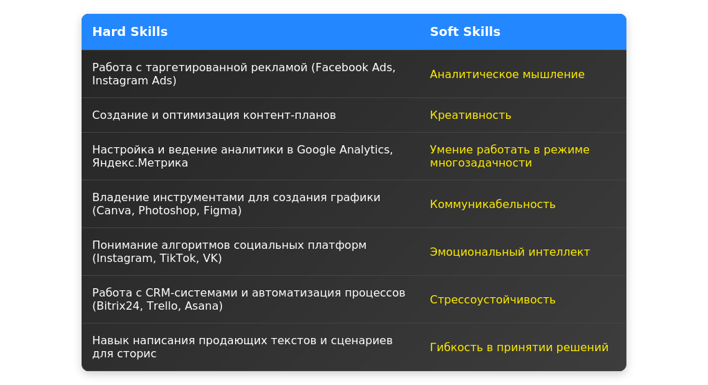 После адаптации: "Навыки ведения Instagram-аккаунтов, создания контента в Canva, анализа эффективности кампаний в Google Analytics."