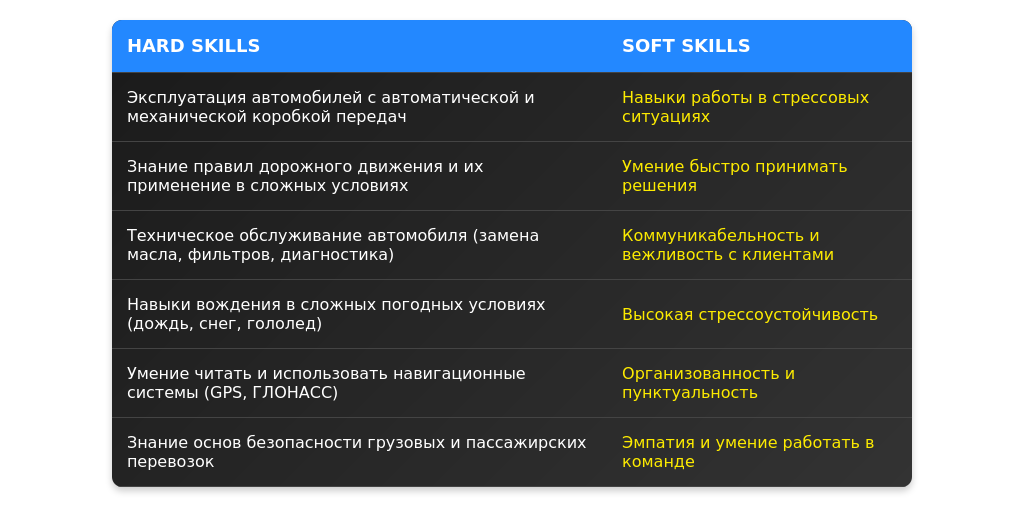 Навыки нужно перегруппировать так, чтобы выделить требуемые компетенции. Например, для водителя такси важны навыки работы с навигационными системами, а для водителя грузовика — знание правил погрузки.