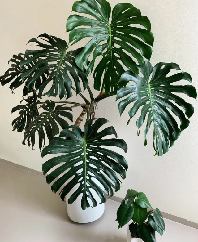 Листья монстеры могут достигать 90 см в длину и 60 см в ширину, что делает их настоящим украшением интерьера. В молодом возрасте листья монстеры цельные, но по мере роста они начинают разделяться, что придаёт растению характерный вид. В дикой природе монстера может образовывать воздушные корни, которые помогают ей цепляться за деревья и другие опоры, что позволяет ей подниматься к свету.