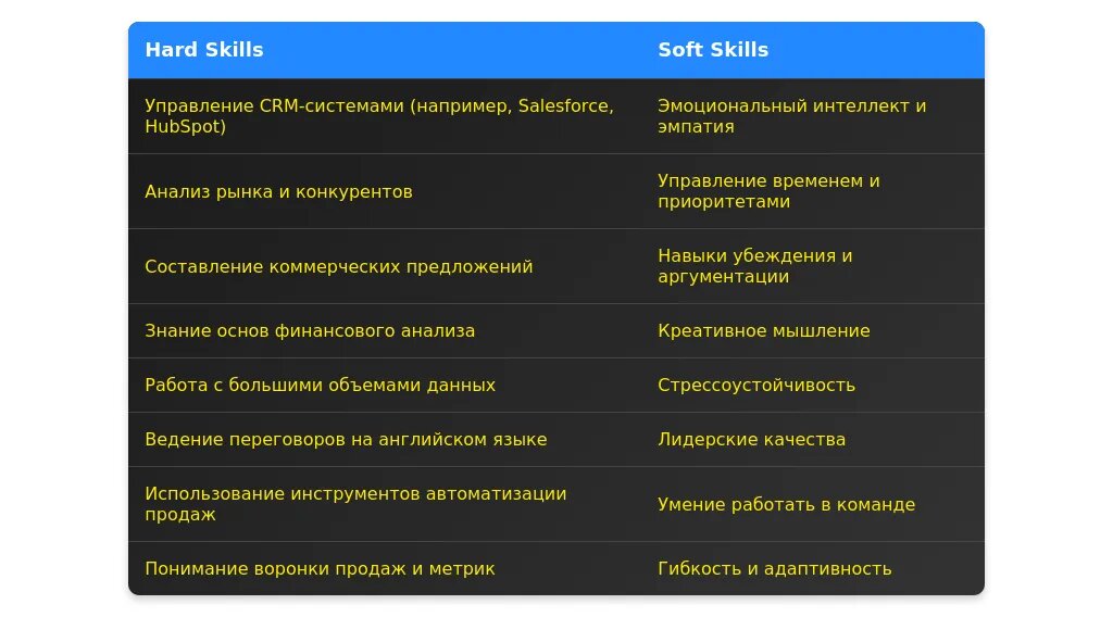 При анализе вакансии важно выделить обязательные и желательные требования. Обязательные требования — это те, без которых кандидат не будет рассмотрен, например, опыт работы в B2B-продажах или знание CRM-систем. Желательные требования — это дополнительные навыки, такие как знание английского языка или опыт работы с международными клиентами. Обращайте внимание на ключевые слова в описании вакансии, такие как "активные продажи", "поиск клиентов", "ведение переговоров", "заключение договоров".