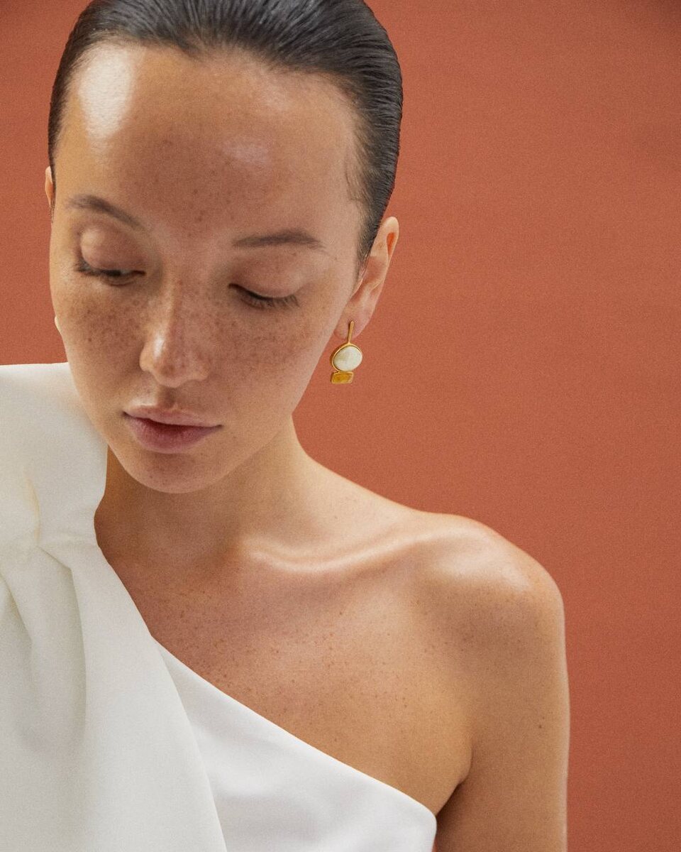 В наличии 2 пары асимметричных сережек с медовым и белым янтарем максимально похожие на те, которые мы показывали на съемке с моделью