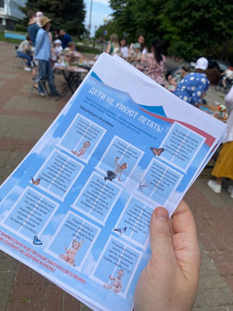На празднике продолжается акция "Дети не летают". Главной целью акции является привлечение внимания взрослых к безопасности детей, листовки напоминают, что нельзя оставлять малышей без присмотра в помещениях с открытыми окнами. Акция проходит в рамках Недели нацпроекта "Семья"