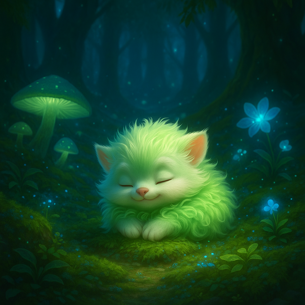 В самом сердце Волшебного Леса, где светятся деревья и поют звёзды, родился пушистый зверёк с зелёной шёрсткой, сверкающей, как утренняя роса. Его звали Луша. Он был не просто милым — Луша обладал даром дарить радость. Когда он улыбался, цветы расцветали, а птицы начинали петь ещё звонче. Но в этих краях жила злая колдунья Морхельда. Она была древней, и очень боялась старости. Морхельда узнала, что малыши из Волшебного Леса наполняют зелье молодости особой силой, и начала красть их, чтобы варить свои чары. Однажды ночью, когда над лесом висела лунная радуга, колдунья пробралась в гнёздышко Луши и украла его. Но едва она поднялась на метле, Луша проснулся. Он не испугался — ведь в его сердце жила магия леса. Пока Морхельда колдовала над котлом, Луша мягко выскользнул из клетки и сбежал. Он бежал долго, через колючие кусты и туманные болота, пока не оказался в совершенно незнакомом месте. Маленький, испуганный и совсем один, он свернулся клубочком под листом и заплакал. Но лес услышал ег