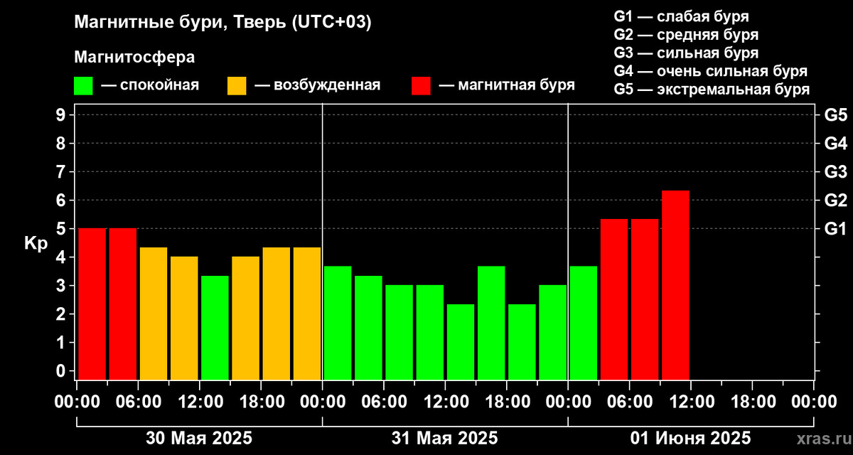 Отметим, что магнитная буря на планете началась в 03:00 ночи, хотя по прогнозам ее первый «удар» ожидался к 15:00 по мск. Согласно прогноз геомагнитного индекса Kp с 1 июня по 3 июня 2025 года для средних широт, сила магнитной бури может достичь G4, что означает очень сильную магнитную бурю.