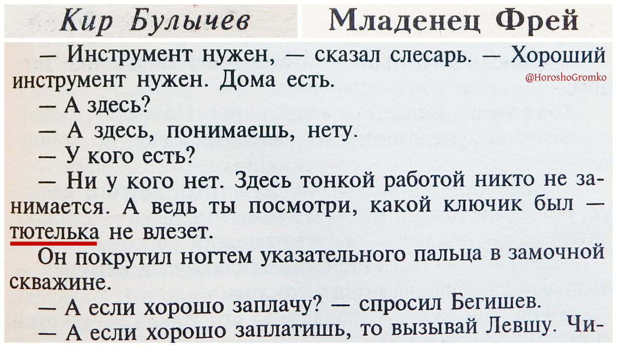 С «Младенцем Фреем» Кира Булычева мы ещё не закончили. Постоянные читатели ХорошегоГромкого книжного блога знают, для меня написать отзыв только половина удовольствия от книги. Вторая, бОльшая и лучшая половина - найти в ней интересные слова 👍🏼 Сегодняшнее слово - тютелька. Хихи смешное 🤭 Сюжет «Младенца Фрея», напомню, состоит в том, что в начале ХХ века, после революции, Ленин, на случай, если всё-таки закрепиться у власти не удастся и придётся из России тикать, заныкал в шведском банке сундук с драгоценностями царской семьи. Вскоре после этого умер, сундук так в Швеции и остался. Основные события романа происходят уже в 1990-х. Шайка аферистов узнала про ленинскую заначку, отправилась в Швецию, забрала сундук из банка и теперь думает, как его открыть. Сундук заперт, ключа нет, и никто не знает наверняка, что внутри. Согласно легенде - золото-бриллианты, но могут быть и какие-нибудь ценные документы, поэтому вскрывать взрывчаткой или сваркой нежелательно. Позвали слесаря. С