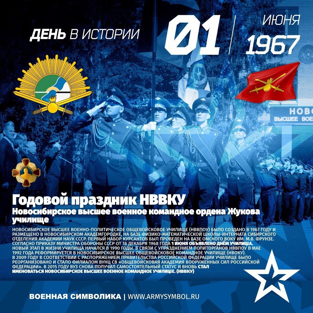 Годовой праздник НВВКУ с 1967 Новосибирское высшее военное командное ордена Жукова училище Новосибирское высшее военно-политическое общевойсковое училище (НВВПОУ) было создано в 1967 году и размещено в Новосибирском Академгородке, на базе физико-математической школы-интерната Сибирского отделения Академии наук СССР. Первый набор курсантов был проведен на базе Омского ВОКУ им. М.В. Фрунзе. Согласно приказу Министра обороны СССР от 16 декабря 1968 года 1 июня объявлено днём училища. Новый этап в жизни училища начался в 1990 годы. В связи с упразднением политорганов НВВПОУ в мае 1992 года реформируется в Новосибирское высшее общевойсковое командное училище (НВОКУ). В 2009 году в соответствии с Распоряжением Правительства Российской Федерации училище было реорганизовано и стало филиалом ВУНЦ СВ «Общевойсковая академия Вооруженных Сил Российской Федерации». В 2015 году ВУЗ снова получил Показать полностью... Подпишитесь на наши группы ВКонтакте и в Одноклассниках - читайте, смотрите и к