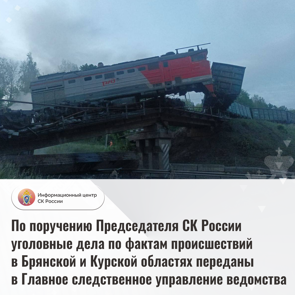 По поручению Председателя Следственного комитета России уголовные дела по фактам происшествий в Брянской и Курской областях переданы в Главное следственное управление ведомства 31 мая 2025 года в 22 часа 50 минут на железнодорожном перегоне Выгоничи — Пильшино в Брянской области произошло обрушение конструкции автомобильного моста, обломки которого упали на проходивший под ним пассажирский поезд. В результате происшествия пострадали и погибли люди. В Железногорском районе Курской области 1 июня 2025 года около 3 часов ночи проходящий железнодорожный состав упал с поврежденного моста на автомобильную дорогу. В результате произошедшего пострадали машинист и 2 его помощника. Уголовные дела по этим происшествиям Председатель СК России поручил расследовать следователям Главного следственного управления ведомства. В настоящее время на местах происшествий работают сотрудники СК России, которыми проводятся неотложные следственные действия, направленные на установление всех обстоятельств произо