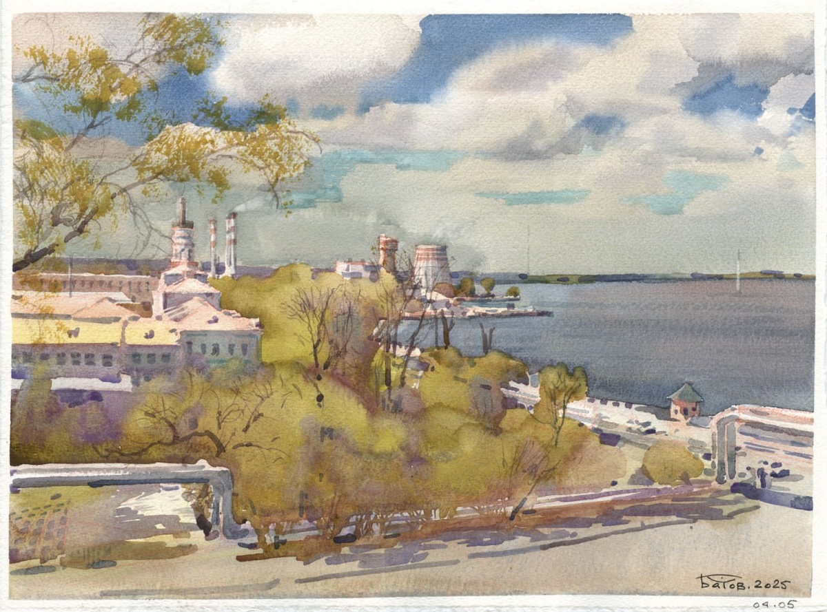 20250504 Ижевский пруд / Pond, Izhevsk / 28x38 / plein air watercolor. Краски Pinax Extra. Бумага 100% хлопок Палаццо 300 гр. Заводская территория около плотины. #Pinax_Extra #palazzo_watercolor_paper #Ижевск #urbansketchers #пленэр #акварель #этюды #watercolor #ИЗО #pleinair_russia