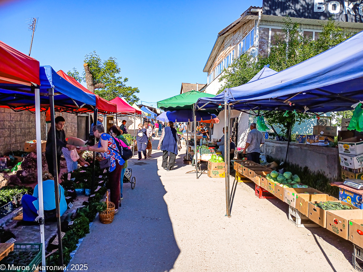 Рынок сегодня хороший, продавцов много. Приехали из окрестных сёл фермеры и частники, поставили навесы от солнца. Много свежих овощей и цветов.