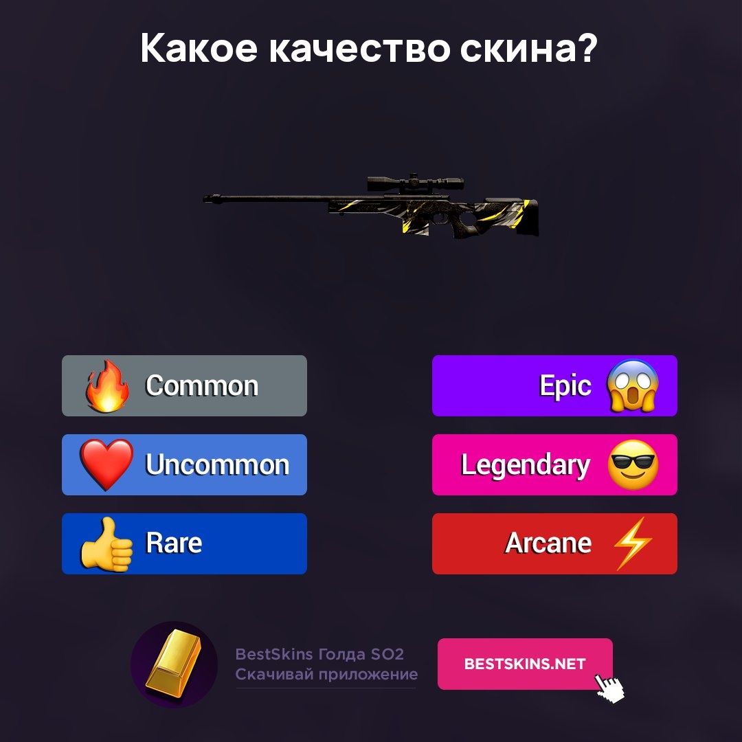 Давайте вместе улучшать знания о скинах! Какое качество? 🤔 Выбирай правильный ответ 🔥 ❤️ 👍 😱 😎 ⚡️