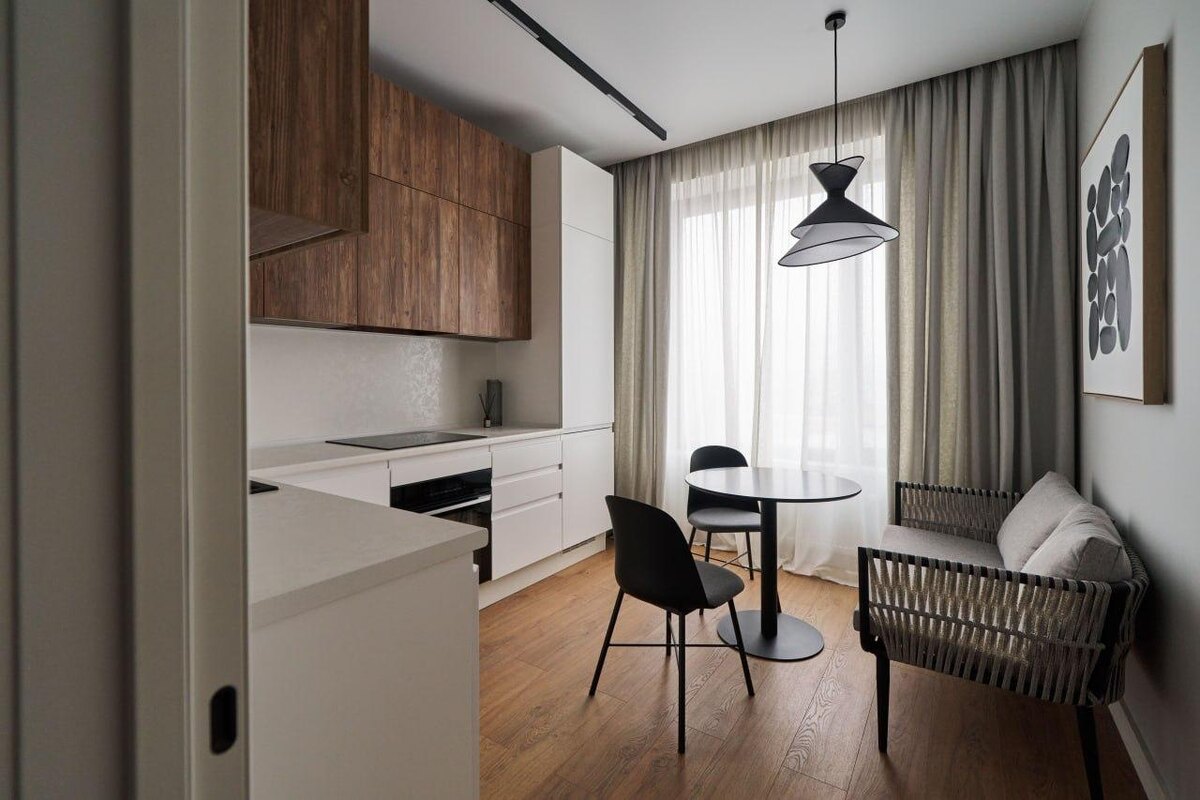 Интерьер этой кухни, для которой мы подбирали мебель — воплощение сдержанной выразительности и продуманной геометрии. Гарнитур выстроен на контрасте: матовые белые модули внизу и теплый, насыщенный оттенок дерева сверху. Чистые линии, отсутствие ручек, продуманная симметрия — интерьер говорит на языке минимализма, но не лишён индивидуальности. Центральную зону занимает круглый обеденный стол, уравновешенный мягким диванчиком, словно созданным для долгих домашних встреч. Изящный светильник с графичным силуэтом работает как интерьерная скульптура, собирая композицию воедино. Плотные шторы добавляют фактуры, смягчают дневной свет и создают атмосферу спокойствия.