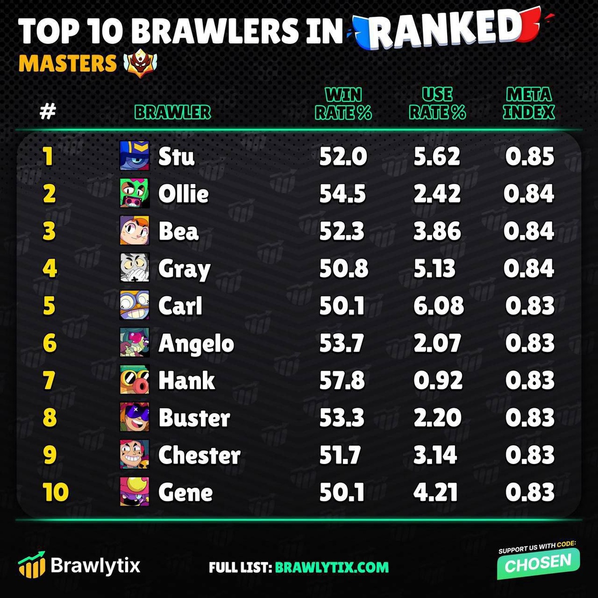 По статистике, самым лучшим бравлером для игры в Ранговом бою для Мастера является Сту, Олли, а также Беа, Грей, Карл и другие бравлеры.