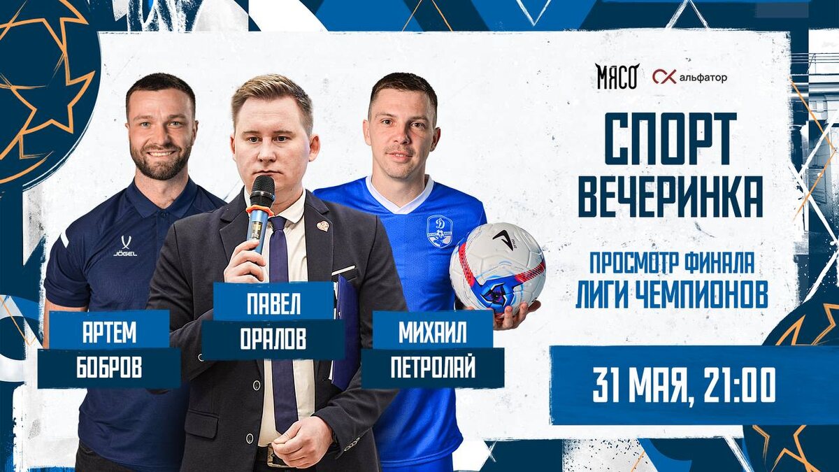 Вечер Лиги Чемпионов 💙 Завтра в ресторане «МЯСО» мы развернём большой экран и устроим уютный футбольный вечер, в рамках которого будет организован просмотр матча «Интер» – «ПСЖ» 🏆 🔹Павел Оралов, Михаил Петролай и Артём Бобров устроят разогрев за час до финала. 🔹разыграем сертификаты и билеты на матч с «Космосом». 🔹Пообщаемся и посмотрим вместе главный матч сезона на большом экране. Проведи время с нами! У нас точно будет атмосферно и зрелищно 🔥 Скорее бронируйте столик: 50-81-51 Сбор гостей в 21:00 Лермонтова, 4 @dynamovologda
