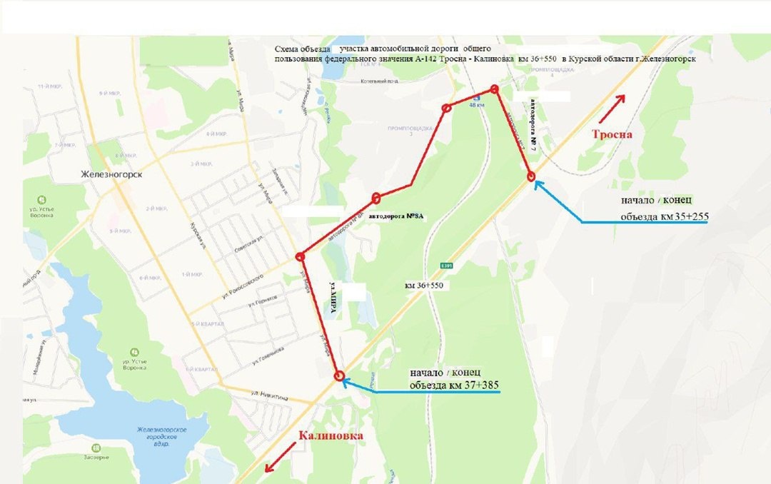 В оперштабе Курской области сообщили, что автодорога, проходящая под мостом на 48-км трассы Тросна – Калиновка в Железногорском районе, перекрыта. Движение транспорта организовано в объезд через город Железногорск.